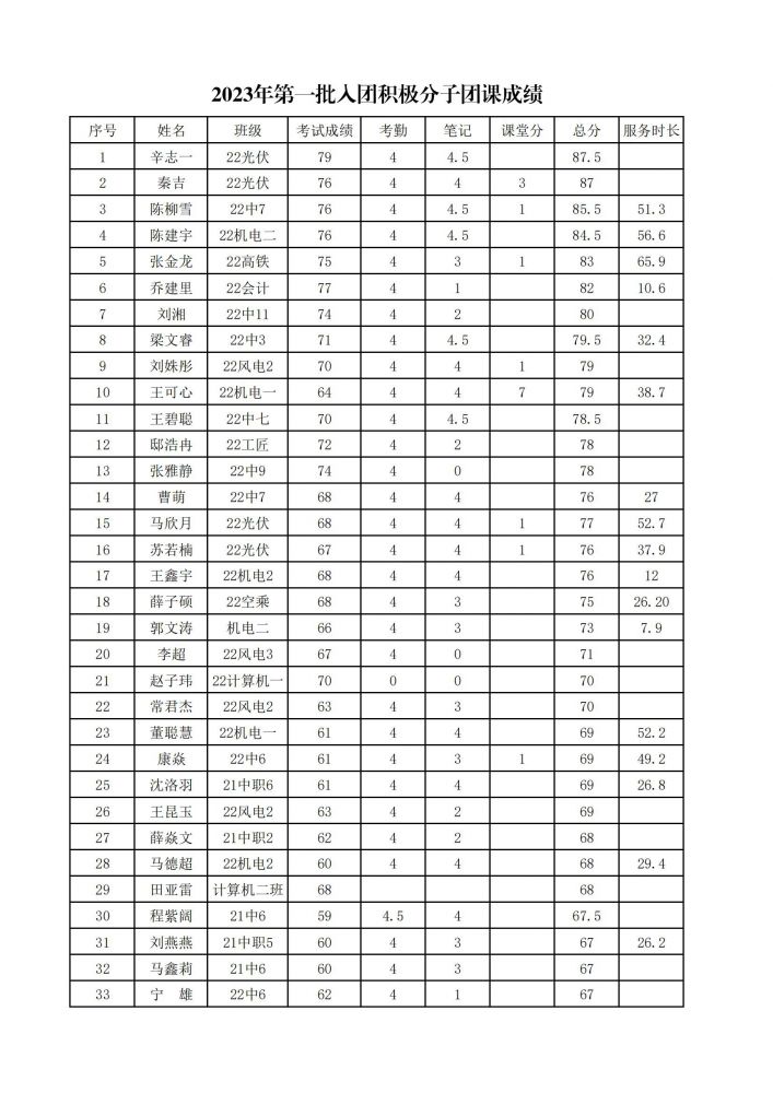 我院2023年第一批入團積極分子團課成績