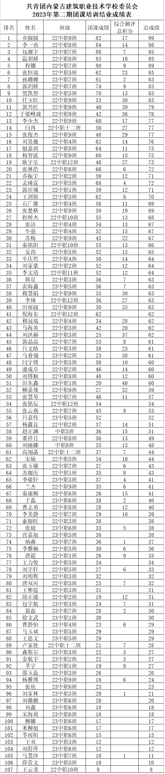 共青團內蒙古建筑職業技術學校委員會2023年第二期團課培訓結業成績公示